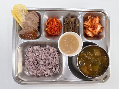 메뉴:흑미밥/우거지된장국/보쌈/보쌈무김치/가지무침/배추겉절이/식혜