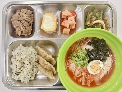 메뉴:후리카베밥/김치말이국수/양념목살구이/찐만두/상추부추무침/깍두기/롤케이크