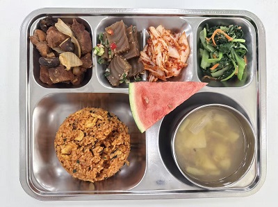 메뉴:고추장비빔밥/감자애호박찌개/돈육장졸임/청경채무침/양념도토리묵/배추김치/계절과일