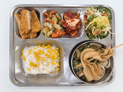 메뉴:옥수수밥/꼬치어묵우동/등심까스/야채샐러드/모듬피클/배추김치/초코롤