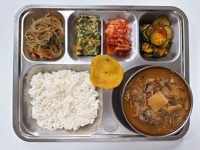 메뉴:찹쌀밥/소고기육개장/해물부추전/버섯잡채/오이부추무침/배추김치/호박찰떡