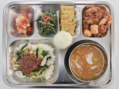 메뉴: 비빔밥/청국된장찌개/고추장주물럭/팽이버섯전/쑥갓무침/배추김치/찐빵