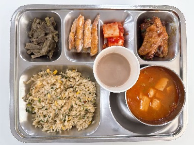 메뉴:콩나물밥/고추장찌개/닭날개조림/꿀고구마스틱/들깨궁채무침/배추김치/핫초코라떼