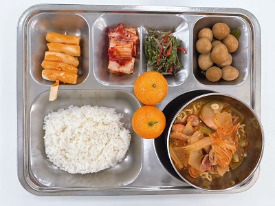메뉴:차조밥/부대찌개/양념떡꼬치/메추리알조림/멸치고추볶음/배추김치/계절과일