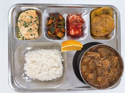 메뉴:찹쌀밥/소고기육개장/영양계란찜/오이부추무침/배추김치/호박찰떡/계절과일
