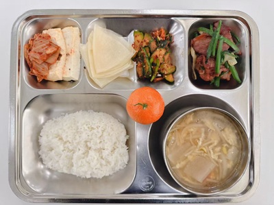메뉴 : 찹쌀밥/황태콩나물국/훈제오리구이/밀전병/두부김치/오이부추무침/계절과일