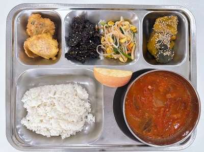 메뉴:백미밥/돈육김치짜글이/동그랑땡/단호박조림/콩나물무침/수제김자반/계절과일