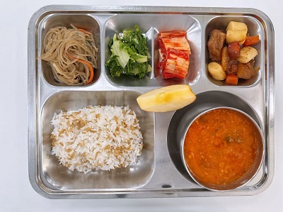 메뉴: 귀리밥/콩비지찌개/순살돈육찜/한식잡채/얼갈이무침/배추김치/계절과일