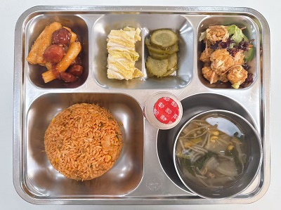 메뉴:김치볶음밥/바지락콩나물국/소떡소떡/케이준샐러드/피클/백김치/요구르트